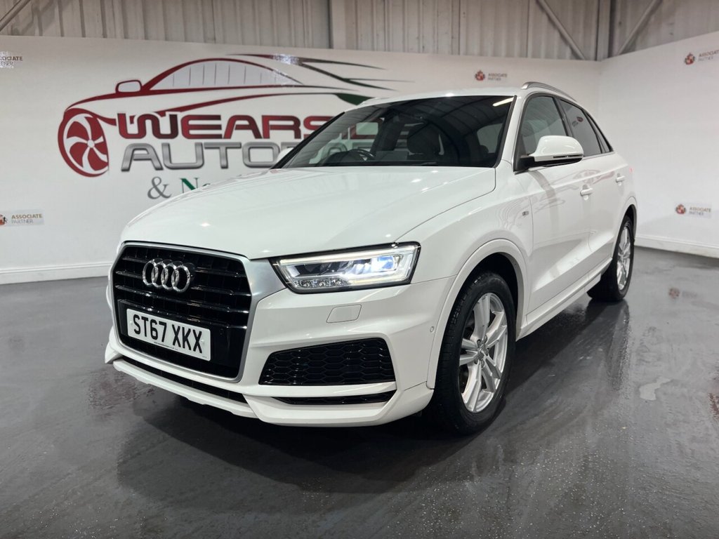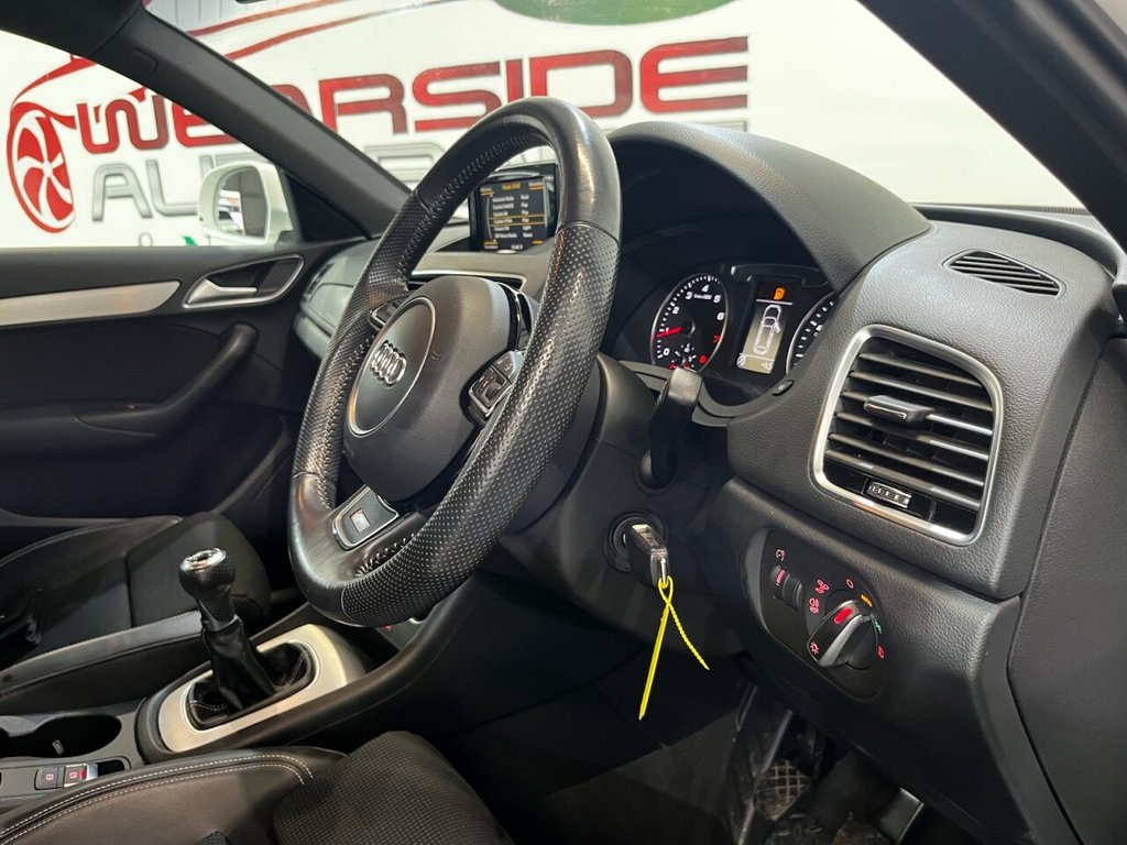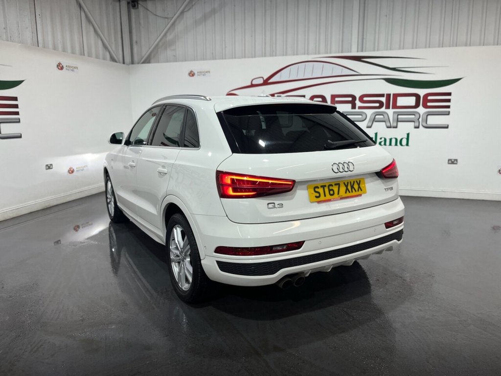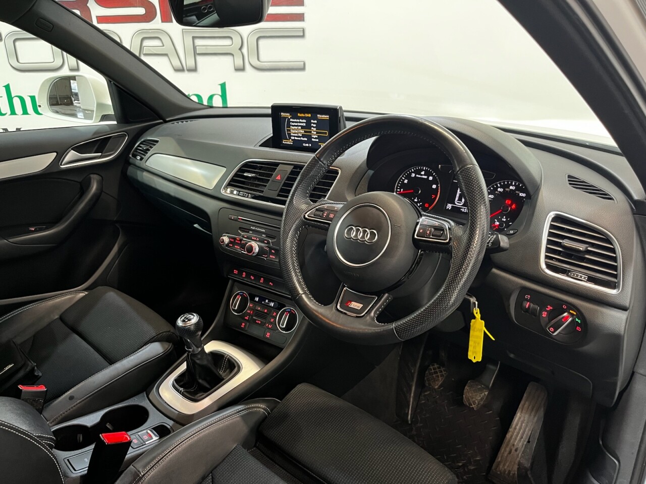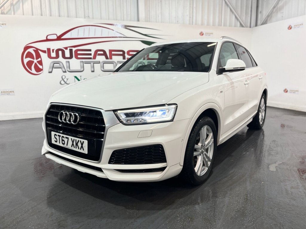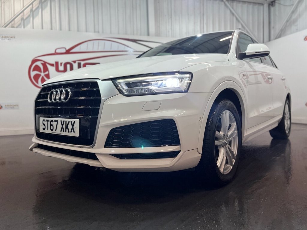 Audi Q3 1.4 TFSI CoD S line Edition SUV 5dr Petrol Manual Euro 6 (s/s) (150 PS). A well-maintained, two-owner example supplied with two keys and a comprehensive service history recorded at 20, 41, 56 and 64 thousand miles. This Q3 offers an excellent combination of style, performance and practicality, presented in the sought-after S line Edition trim. The specification includes alloy wheels, front and rear parking sensors, privacy glass, a half leather interior, electric power tailgate, climate control, heated folding mirrors, automatic headlights, cruise control, satellite navigation, DAB digital radio and Bluetooth connectivity. Powered by Audi's efficient 1.4 TFSI Cylinder-on-Demand petrol engine producing 150 PS, this Q3 delivers smooth and responsive performance while maintaining impressive fuel economy. A premium compact SUV offering comfort, technology and quality throughout.