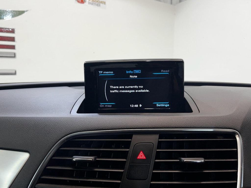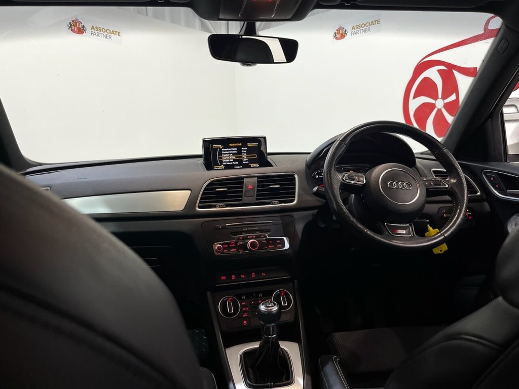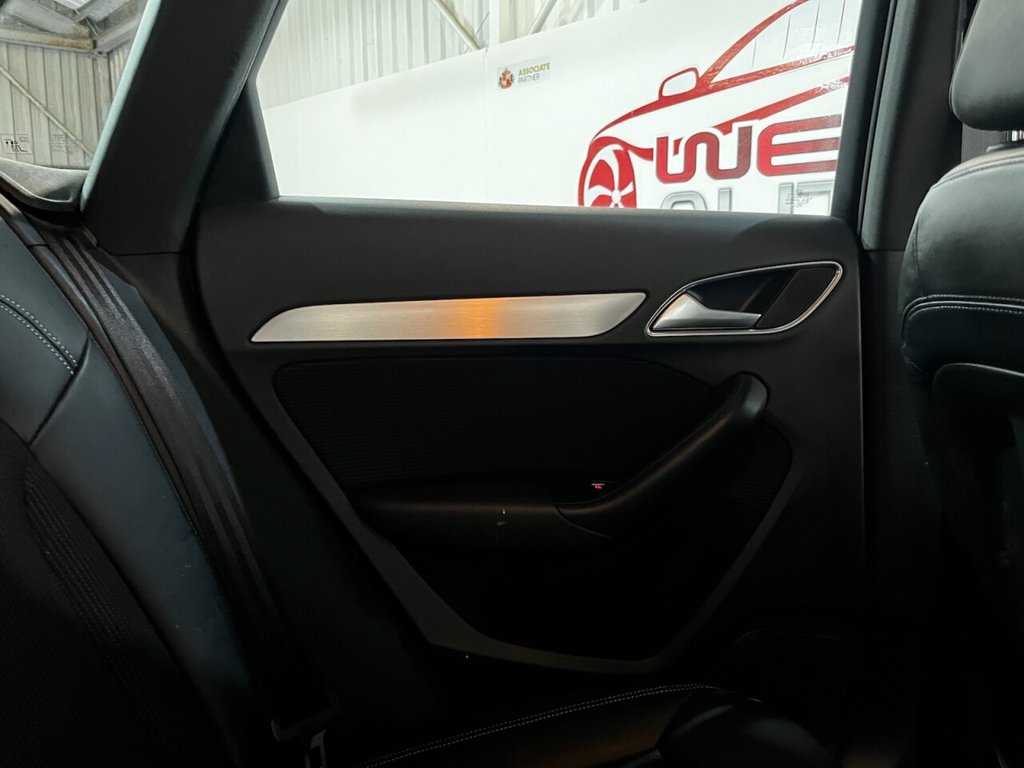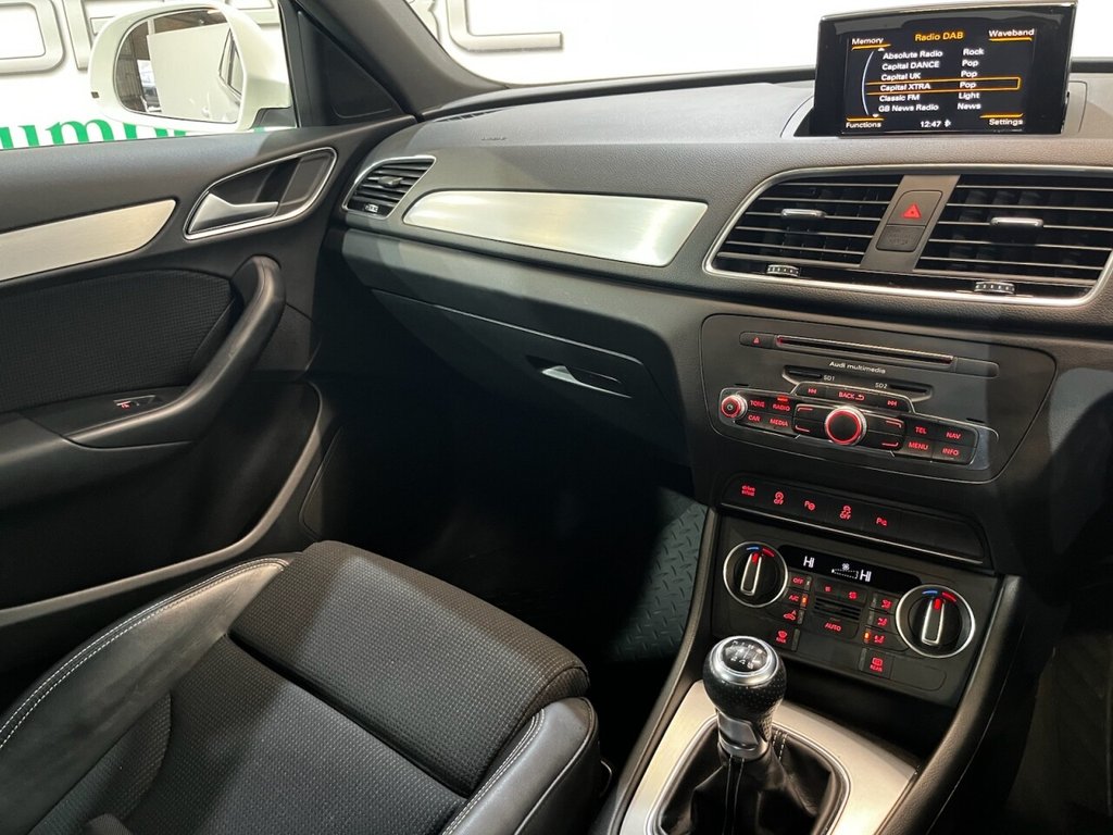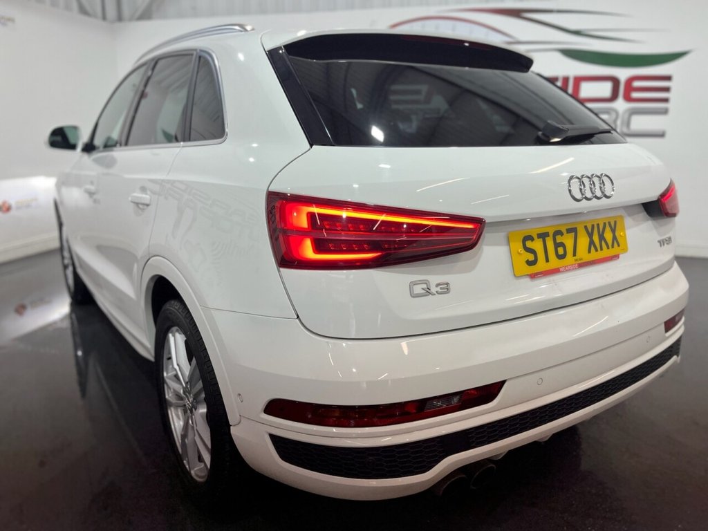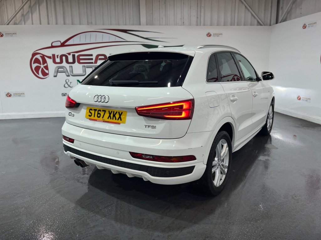 Audi Q3 1.4 TFSI CoD S line Edition SUV 5dr Petrol Manual Euro 6 (s/s) (150 PS). A well-maintained, two-owner example supplied with two keys and a comprehensive service history recorded at 20, 41, 56 and 64 thousand miles. This Q3 offers an excellent combination of style, performance and practicality, presented in the sought-after S line Edition trim. The specification includes alloy wheels, front and rear parking sensors, privacy glass, a half leather interior, electric power tailgate, climate control, heated folding mirrors, automatic headlights, cruise control, satellite navigation, DAB digital radio and Bluetooth connectivity. Powered by Audi's efficient 1.4 TFSI Cylinder-on-Demand petrol engine producing 150 PS, this Q3 delivers smooth and responsive performance while maintaining impressive fuel economy. A premium compact SUV offering comfort, technology and quality throughout.