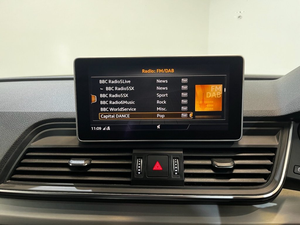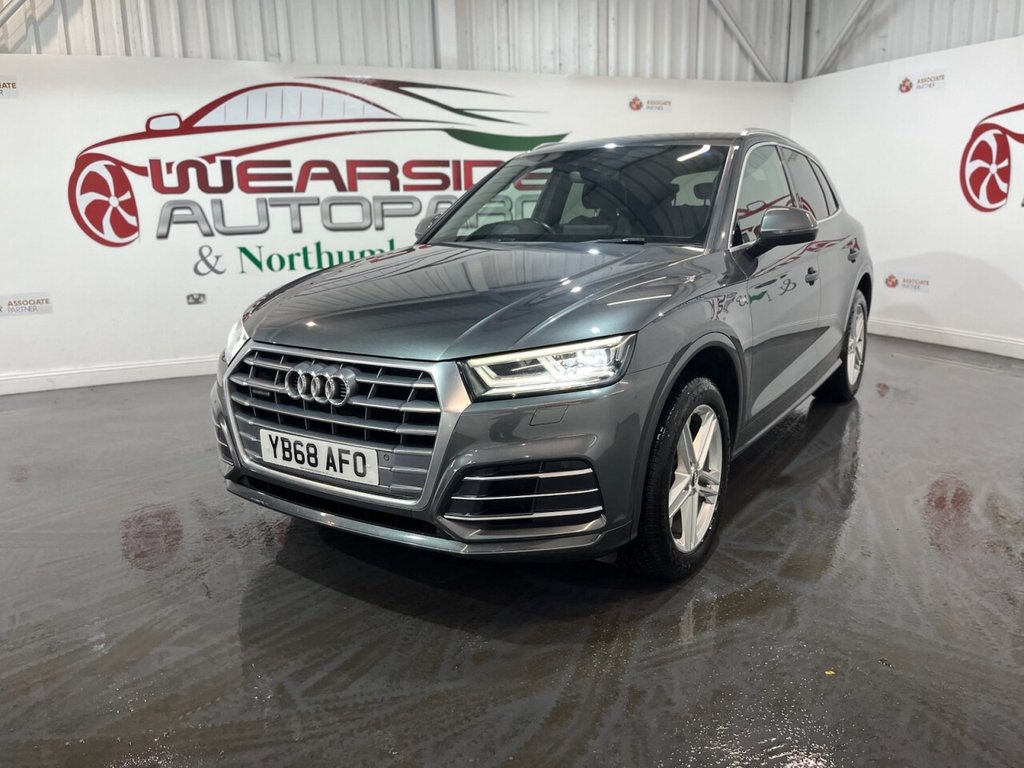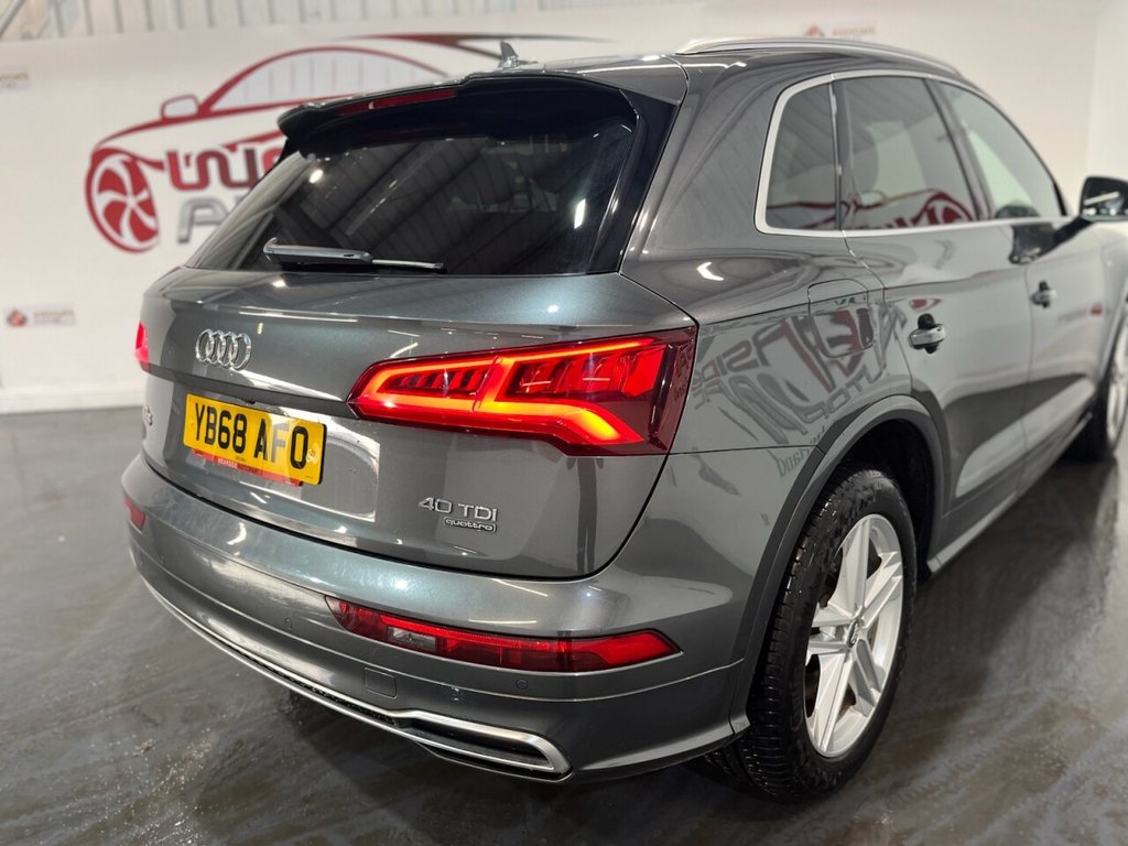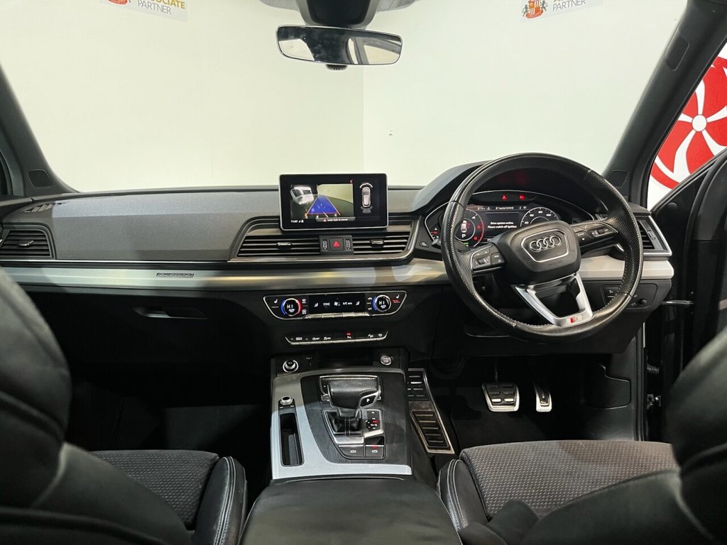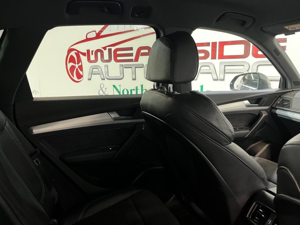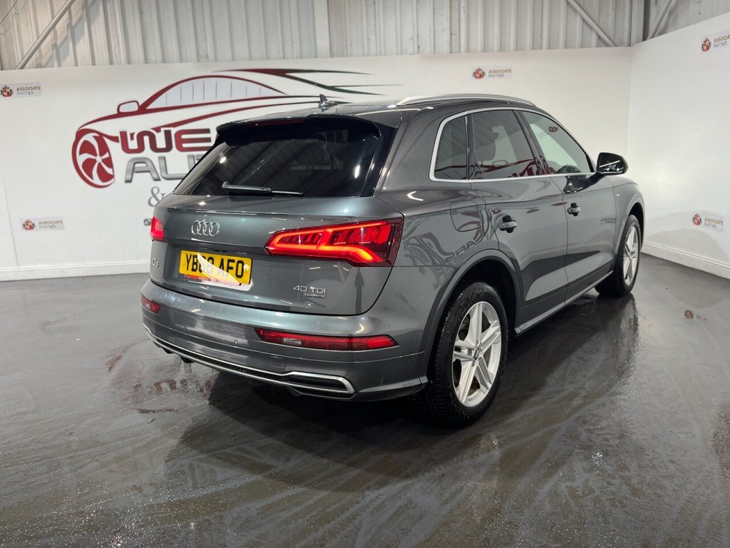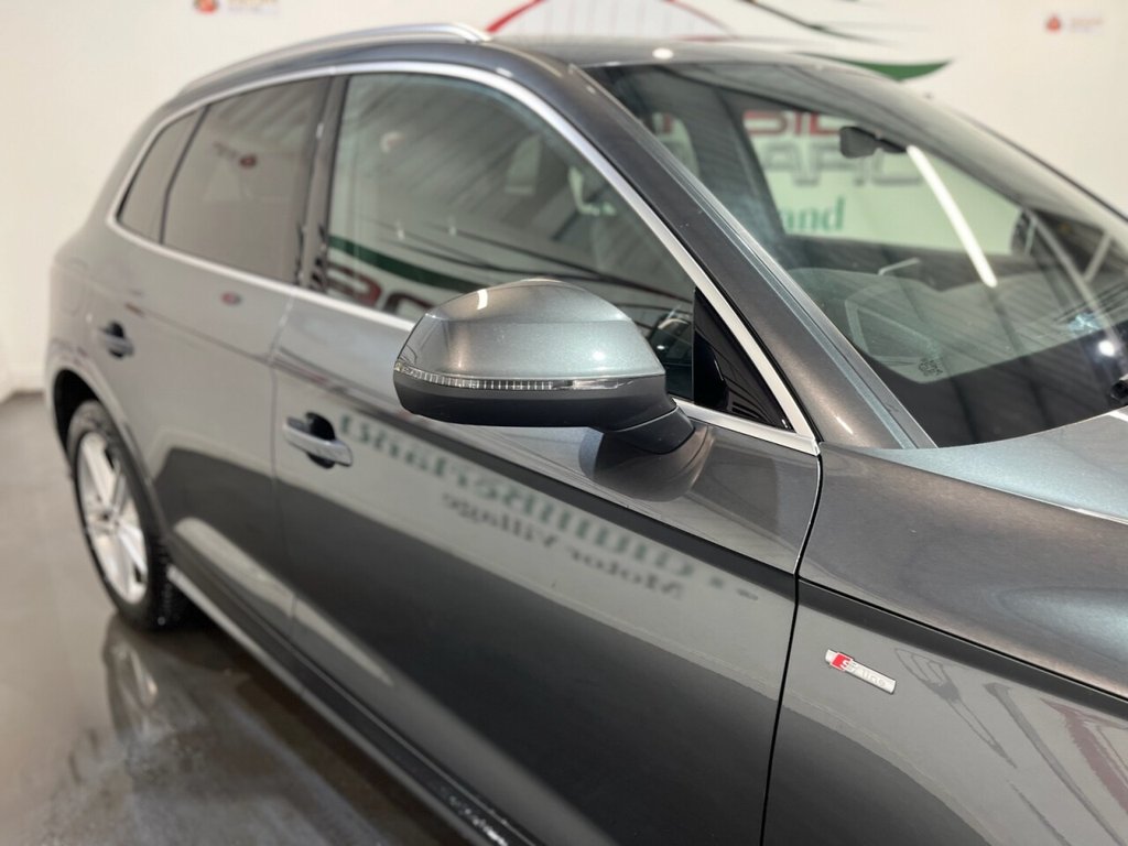 Audi Q5 2.0 TDI 40 S line SUV 5dr Diesel S Tronic quattro Euro 6 (s/s) (190ps). Supplied with a full, mostly Audi main dealer service history recorded at 5,000, 18,000, 34,000, 42,000, 56,000 and 73,000 miles. In addition, the vehicle has benefitted from two brake fluid services at 34,000 and 56,000 miles, and a gearbox service at 42,000 miles. This well-maintained Q5 S line offers a refined driving experience with the 2.0 TDI diesel engine producing 190ps, paired with the S Tronic automatic gearbox and quattro all-wheel drive system. The high specification includes alloy wheels, keyless start, privacy glass, reverse camera, electric split power tailgate, wireless phone charging, climate control, heated door mirrors, automatic headlights, digital dashboard, Bang & Olufsen sound system, cruise control, half leather interior, heated front seats, satellite navigation, DAB radio and Bluetooth connectivity. A premium SUV combining comfort, technology and performance, supported by an excellent maintenance record.