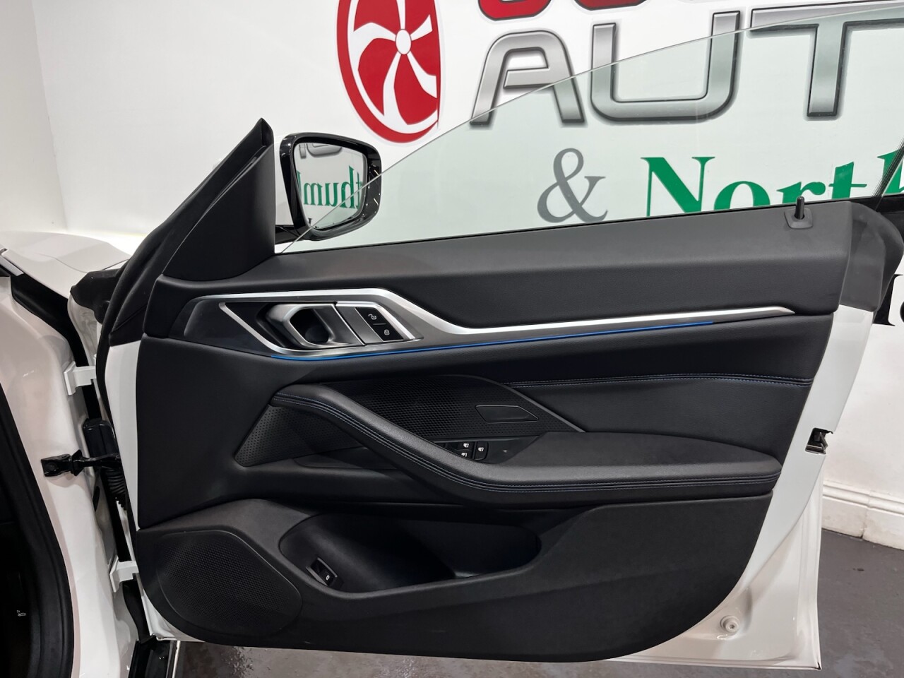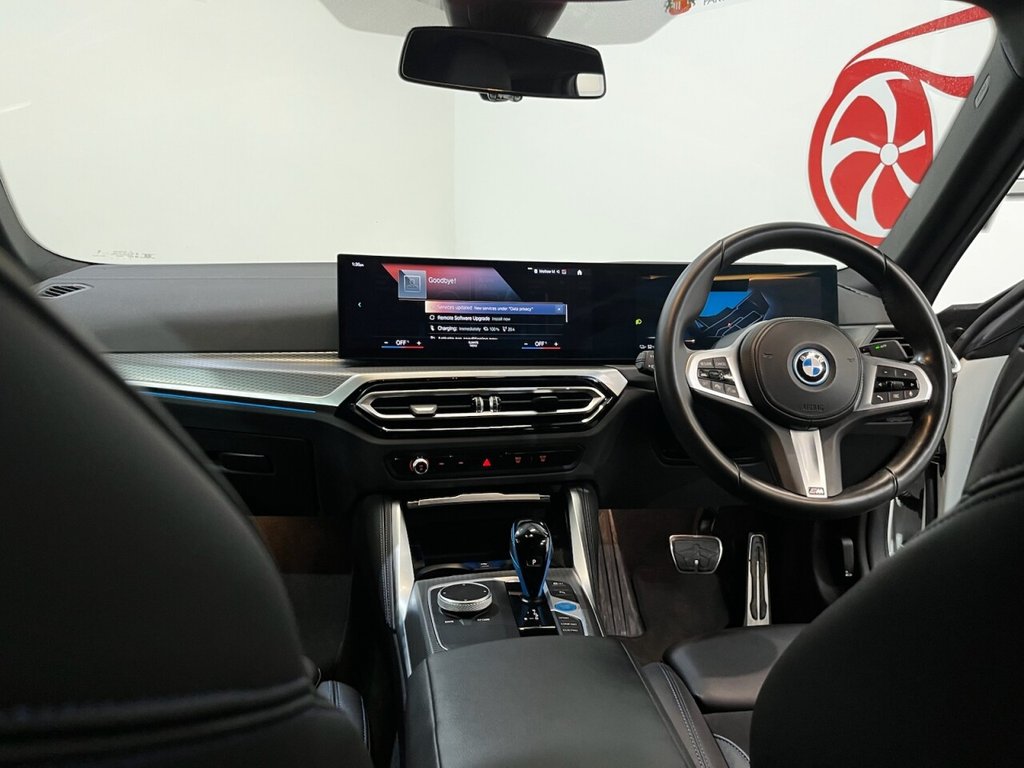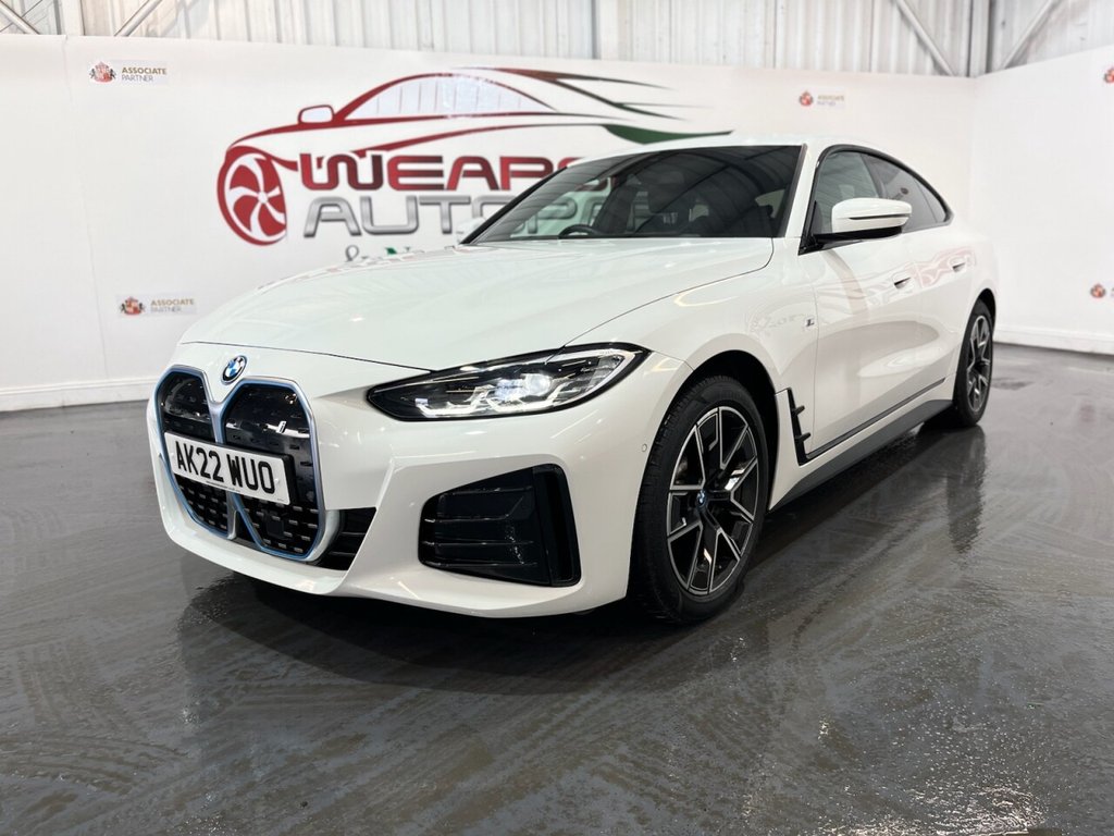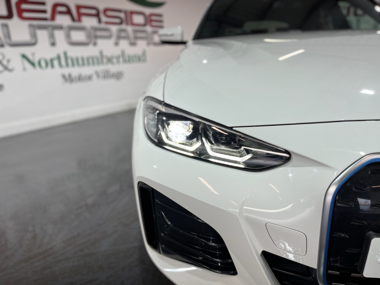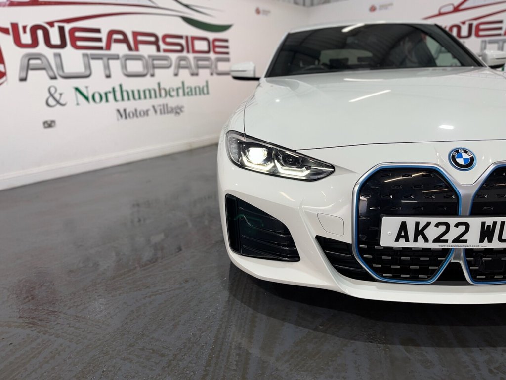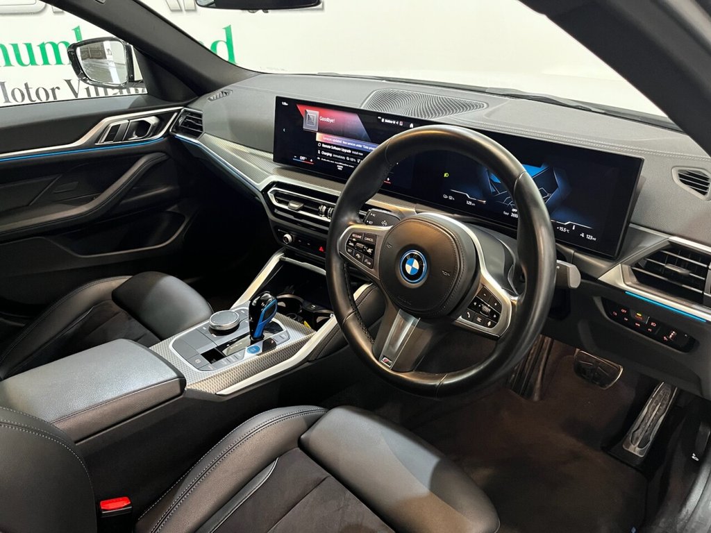 BMW i4 40 83.9kWh M Sport Gran Coupé 5dr Electric Auto eDrive (340ps). One-owner car supplied with two keys and a BMW iDrive service history recorded at 16,000 miles. This car also has 5 years remaining BMW warranty on the battery. This impressive i4 M Sport combines dynamic performance and premium comfort with all-electric efficiency, delivering 340ps through BMW's eDrive system. The high specification includes 18" alloy wheels, digital dashboard, cruise control, front and rear parking sensors, automatic headlights and wipers, privacy glass, electric power tailgate, Apple CarPlay, Android Auto, satellite navigation, climate control, front and rear heated seats, heated steering wheel, USB connection and Bluetooth connectivity. A superb one-owner example offering luxury, technology and powerful all-electric performance in an elegant Gran Coupé body.