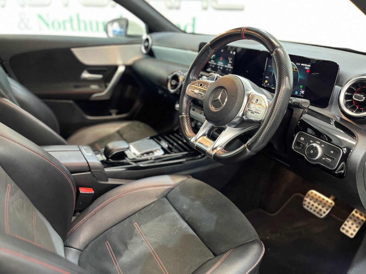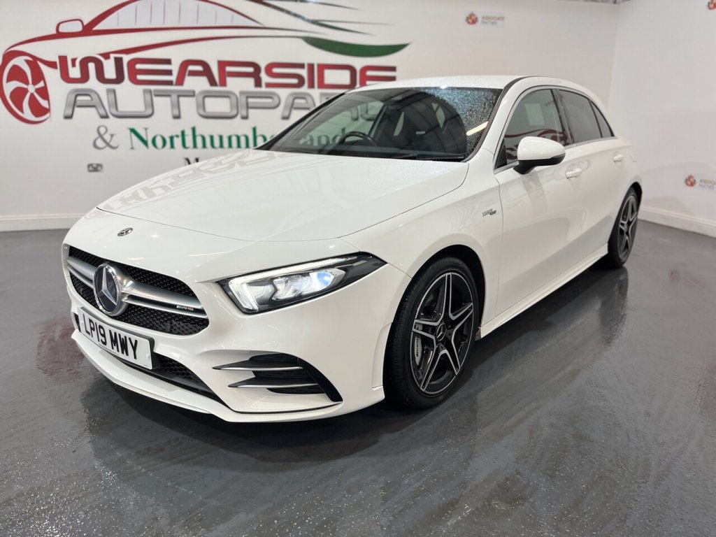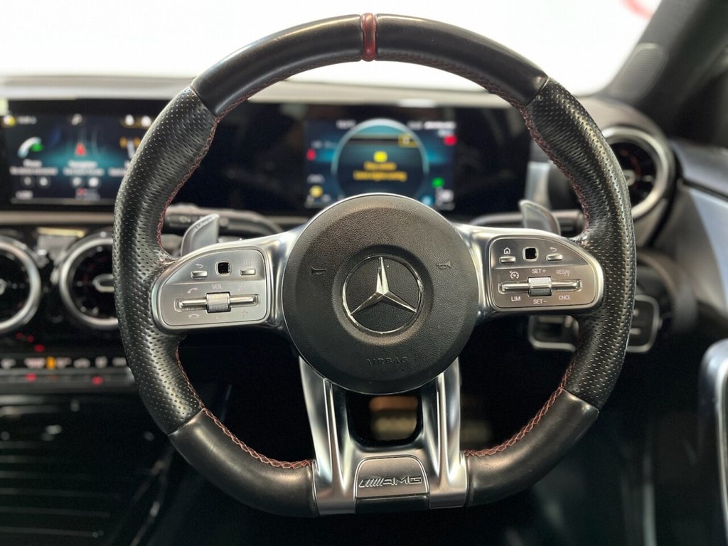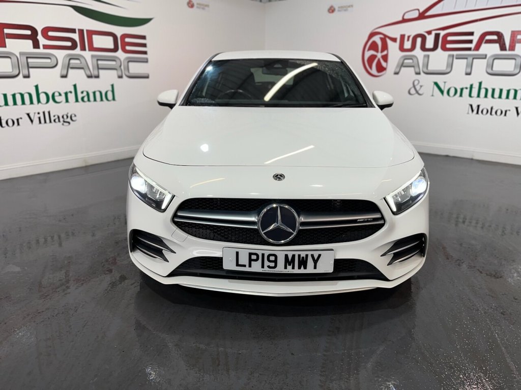 Mercedes-Benz A-Class 2.0 A35 AMG Hatchback 5dr Petrol SpdS DCT 4MATIC Euro 6 (s/s) (306 PS). Supplied with two keys and a Mercedes-Benz main dealer service history, with services recorded at 11,000 and 21,000 miles. This A35 AMG delivers sharp performance, sporty styling and the reassurance of 4MATIC all-wheel drive. The specification includes alloy wheels, privacy glass, satellite navigation, DAB radio, Bluetooth connectivity, reverse camera, cruise control, red seatbelts, AMG flat-bottom steering wheel and air conditioning. A well-presented hot hatch combining everyday usability with AMG power and presence.