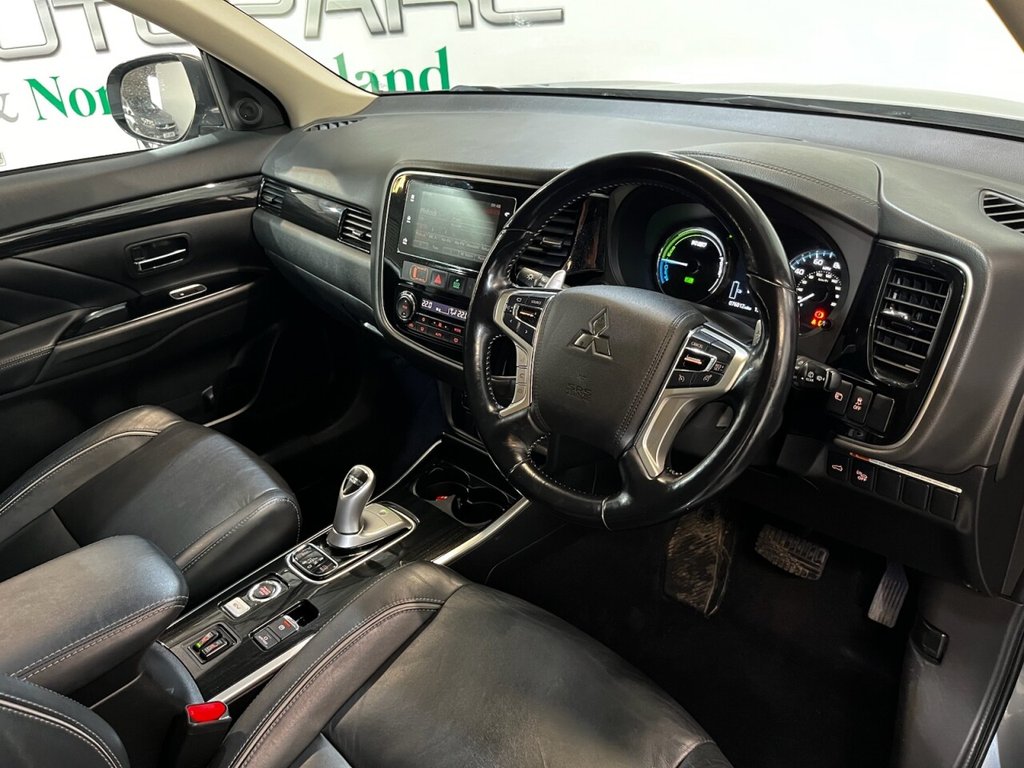 Mitsubishi Outlander 2.0h 12kWh 4h SUV 5dr Petrol Plug-in Hybrid CVT 4WD Euro 6 (s/s) (200ps). Supplied with two keys and a Mitsubishi main dealer service history recorded at 14,000 and 29,000 miles. This Outlander 4h Plug-in Hybrid combines impressive efficiency with comfort and practicality, powered by a 2.0 petrol engine and electric motor producing a combined 200ps, paired with a smooth CVT gearbox and 4WD system. The high specification includes 18" alloy wheels, cruise control, climate control, electric power tailgate, full leather interior, reverse and surround view cameras, heated front seats, privacy glass, USB connection, heated steering wheel, electric driver's seat, DAB radio and Bluetooth connectivity. A well-maintained and highly equipped hybrid SUV offering comfort, technology and economy in equal measure.